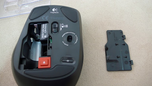 A closer look. Notice I have inserted the receiver 1/2 way. The red button pops out the receiver into this position when pressed down. Also notice the battery compartment. Unlike other mice, the battery is loaded on top of each other, not side by side. Kinda like loading a Gerald rifle, if you know what I mean.